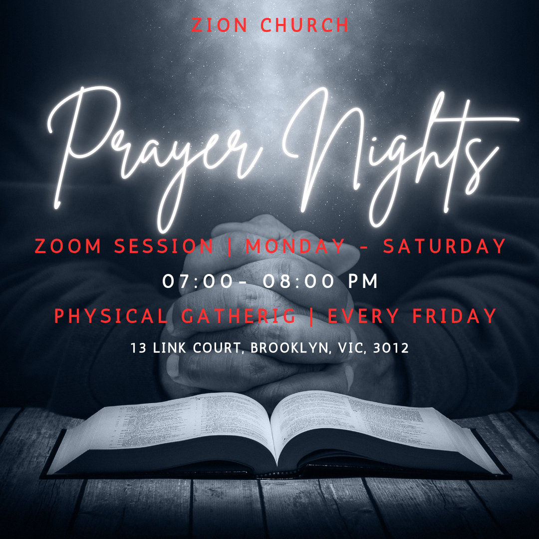 We offer daily Zoom prayer sessions from Monday to Saturday, between 7:00 PM and 8:00 PM. On Fridays, you are welcome to join us either in person at our church building or through Zoom.